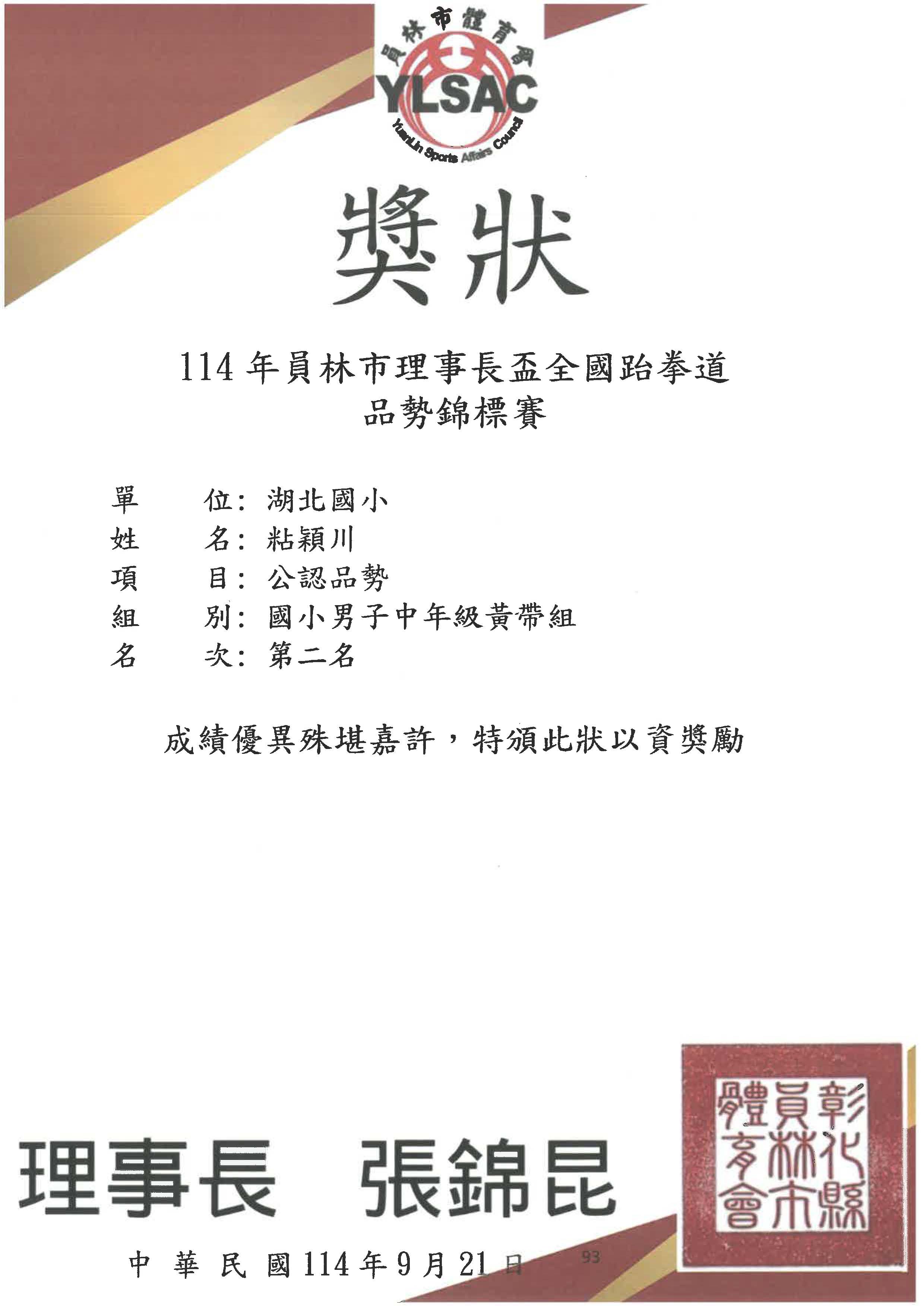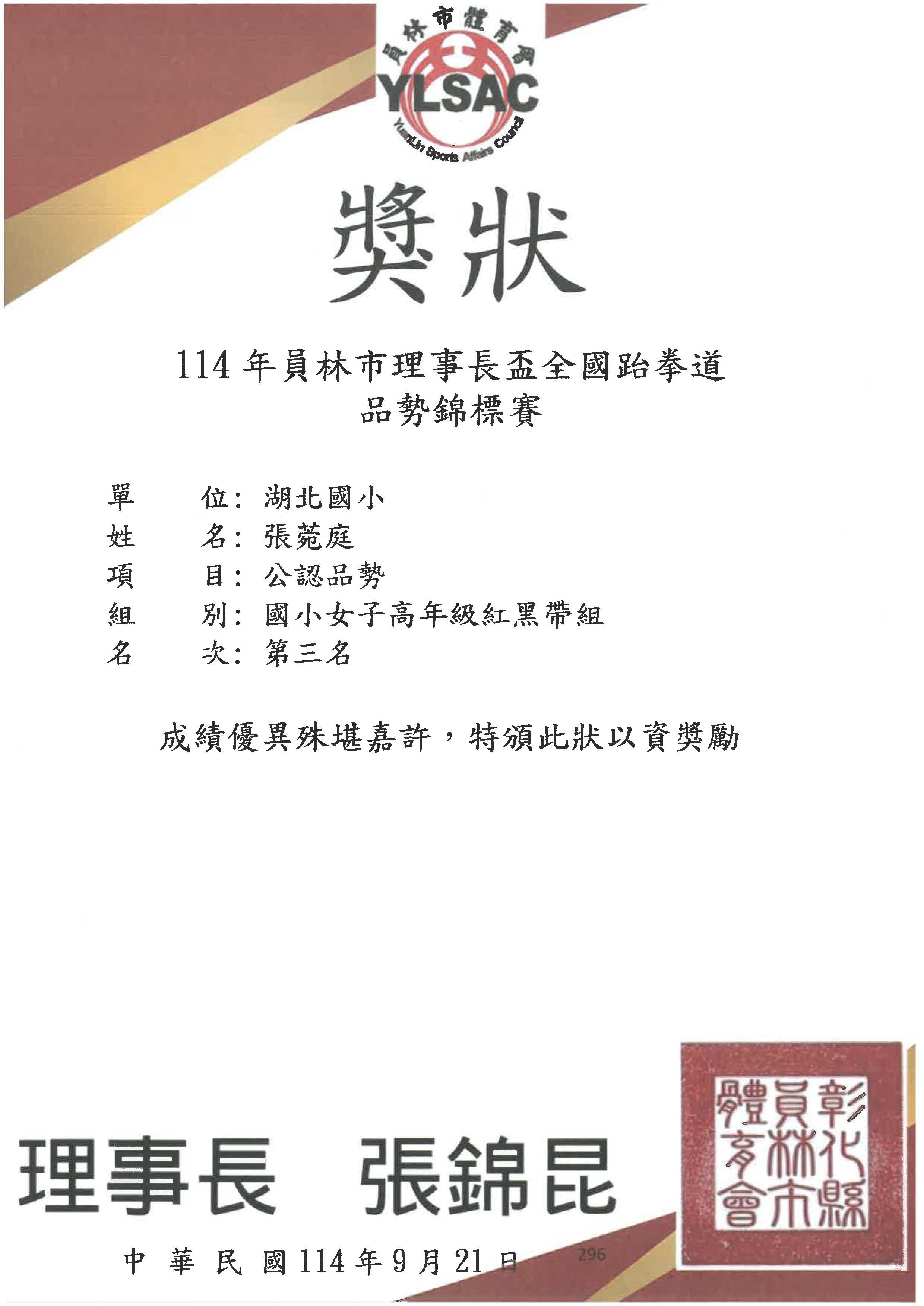 503 張菀庭 302粘穎川 參加114年員林市理事長盃全國跆拳道品勢錦...
