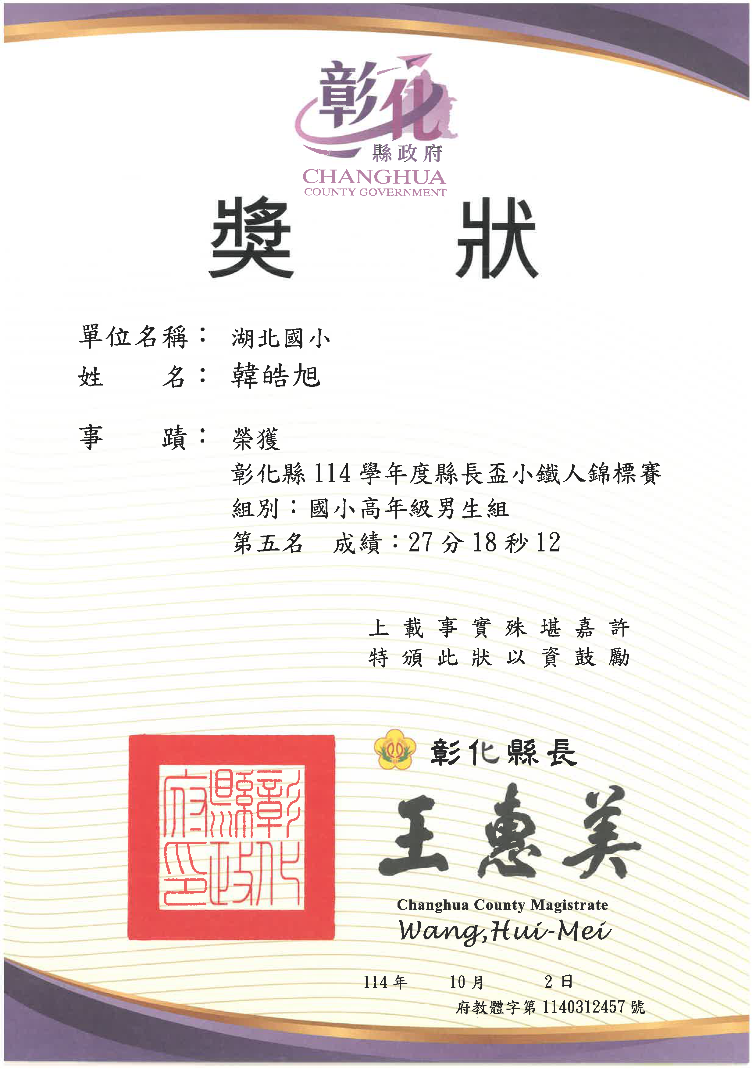 601韓皓旭參加彰化縣114學年度縣長盃小鐵人錦標賽榮獲國小男生高年級組第五名