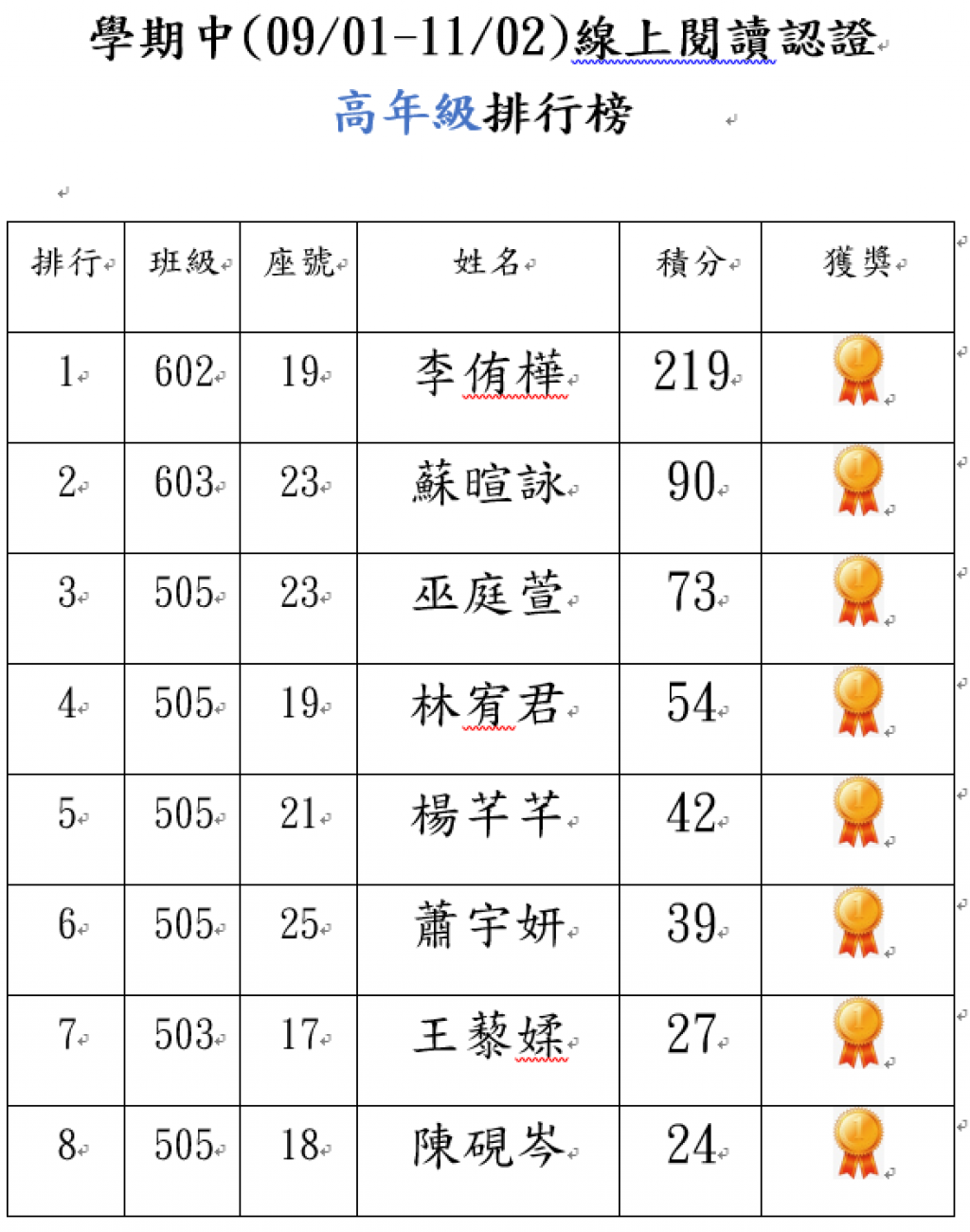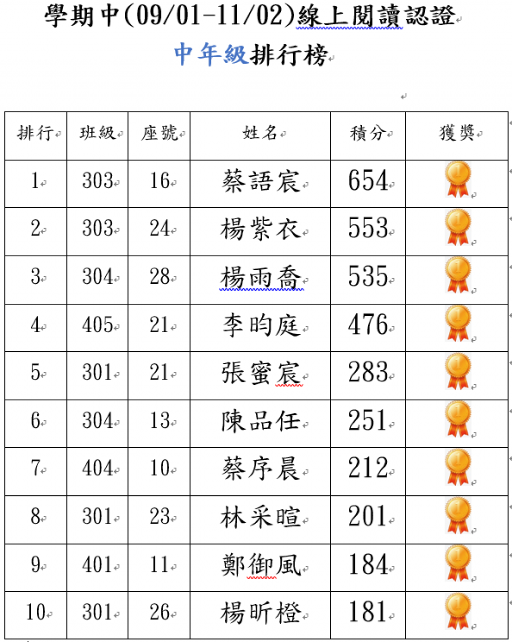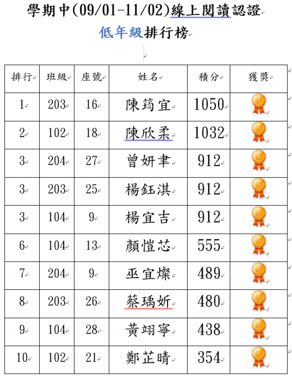 湖北國小114學年度3、4年級校內打字比賽優勝名單
