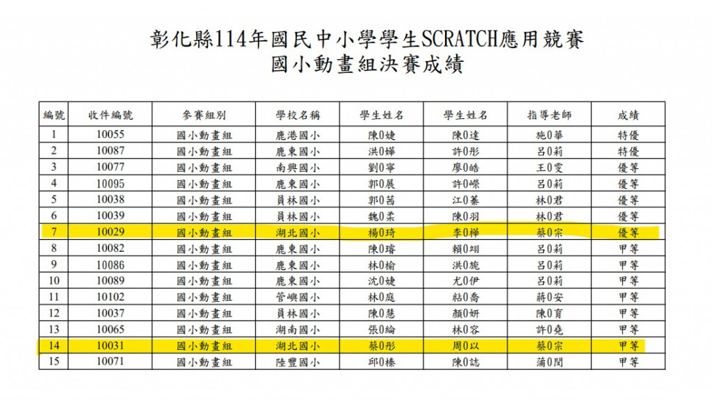 本校參與參與「114年國民中小學學生SCRATCH應用競賽」榮獲佳績, 感謝校長和導師們、家長對學生競賽的鼓勵與支持。 601楊芷琦、602李侑樺 獲得國小動畫組 優等 502蔡佳彤、502周芮以 獲得國小動畫組 甲等