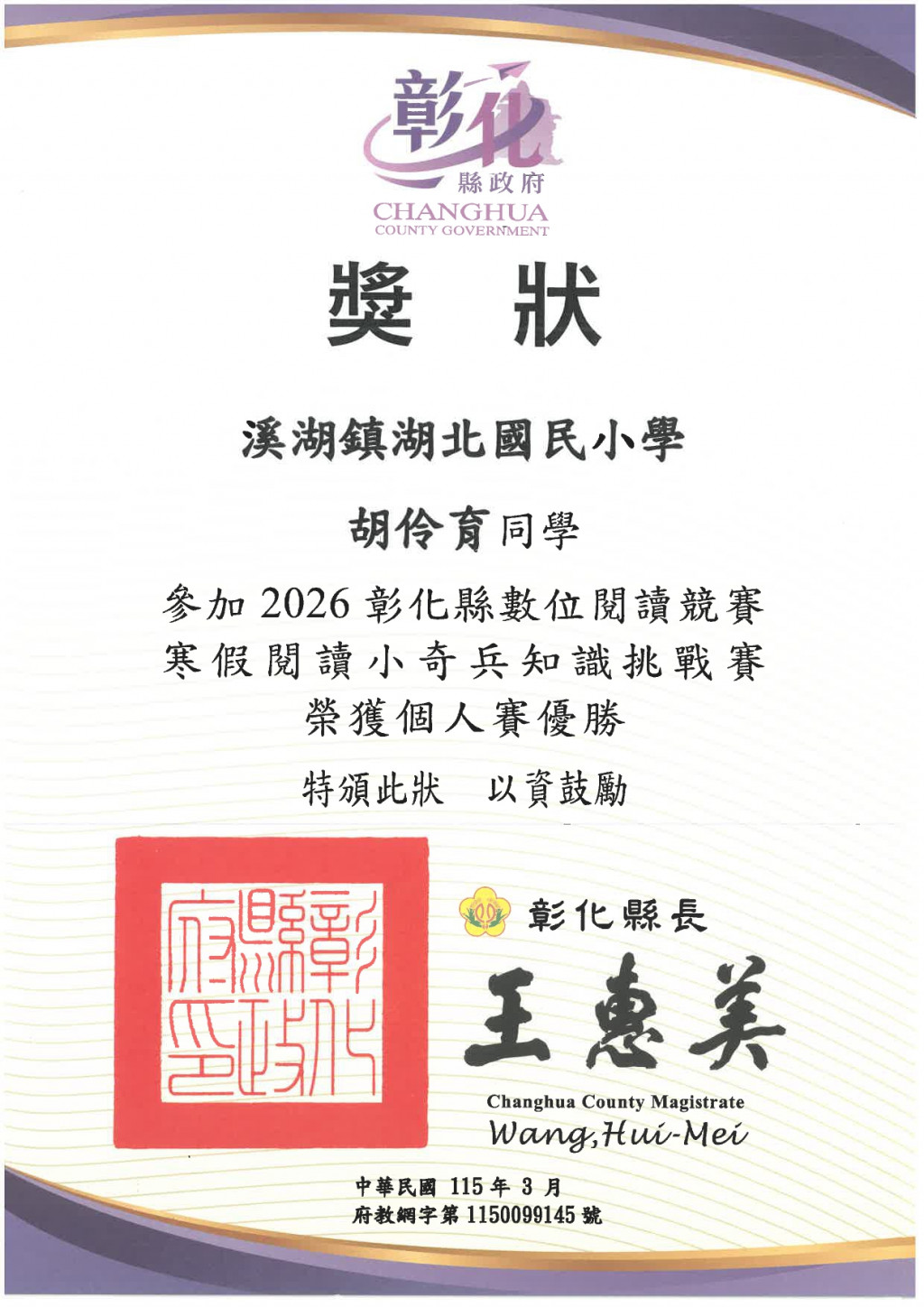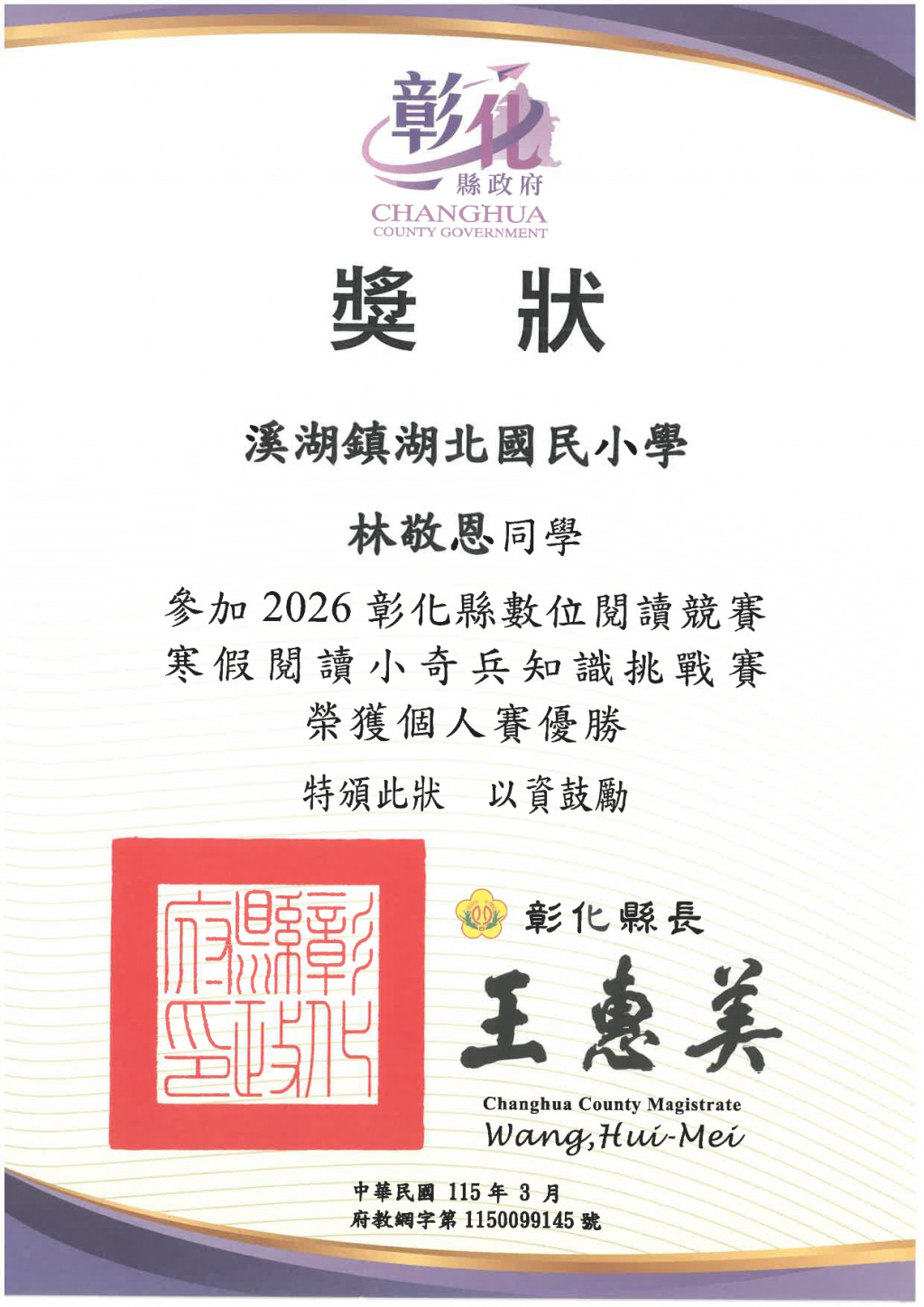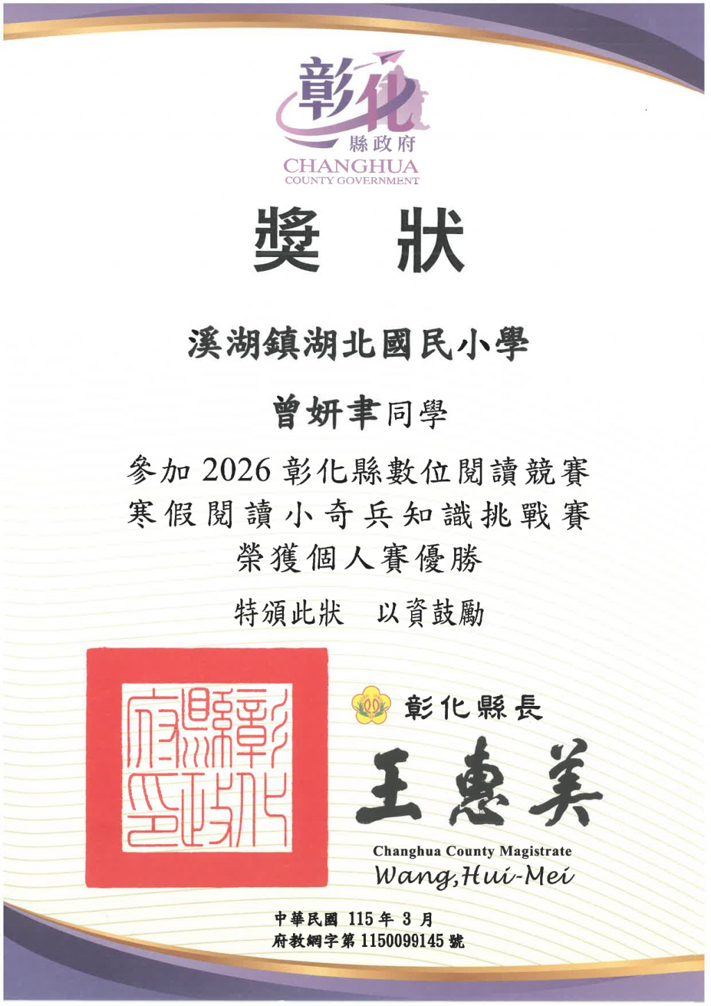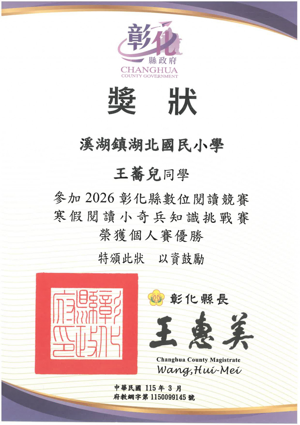 105 胡伶育 204 王蕎兒 204 林敬恩 204 曾妍聿 參加2026彰化縣數位閱讀競賽寒假閱讀小奇兵知識挑戰賽 榮獲個人賽優勝