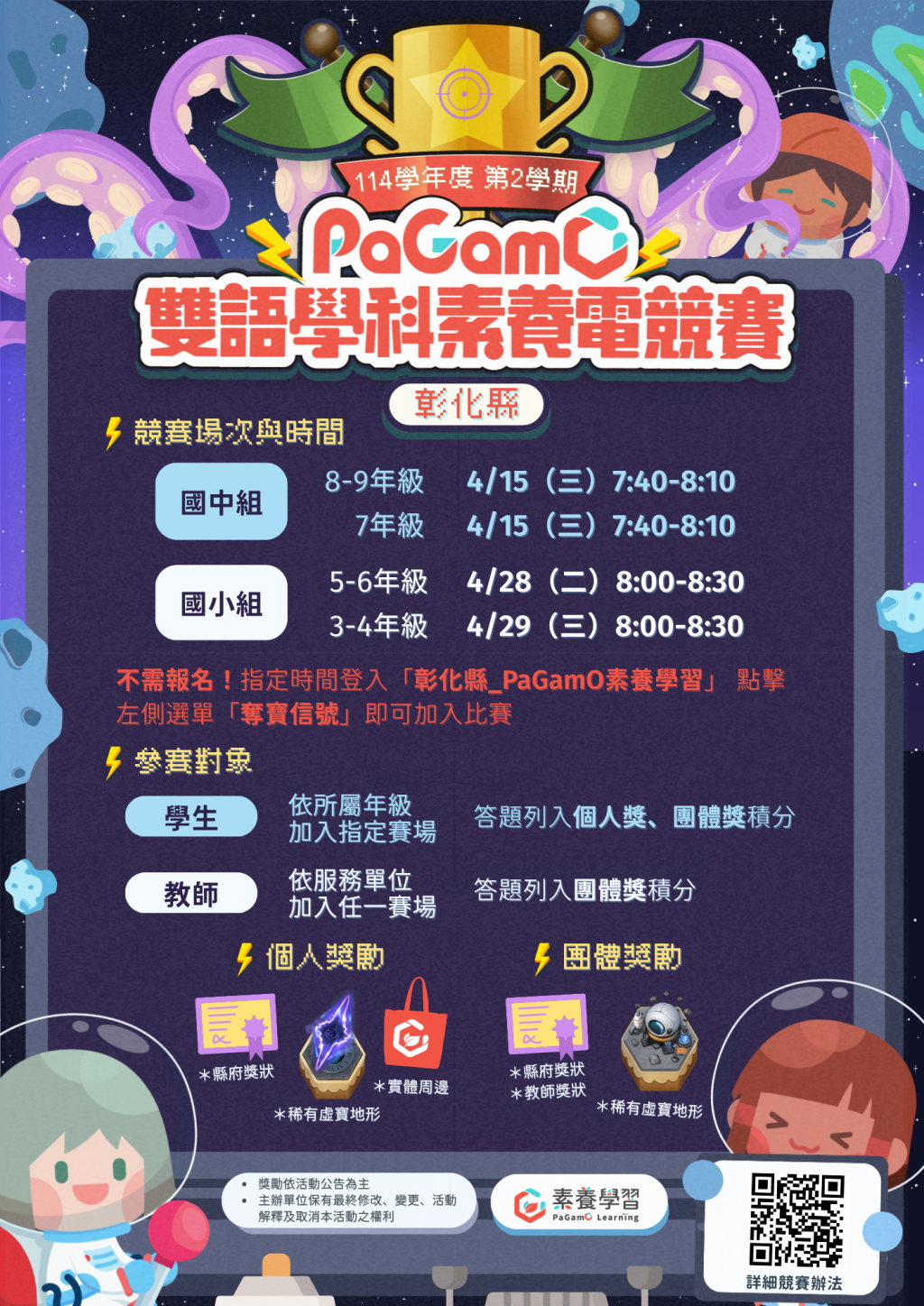 四、賽事獎勵分為個人獎、團體獎、參賽獎勵等,獎品以PaGamO虛擬寶物為主,部分獎項亦派發本府獎狀(註:不列入升學比序積分)。競賽規則、積分計算及詳細內容請參閱計畫書。